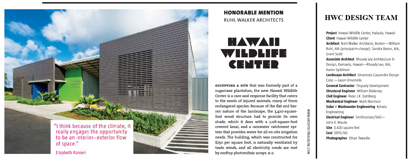 The Hawaii Wildlife Center has won one of only 21 national design awards selected by a jury of well known architects for Architecture magazine’s annual design review. The HWC won within the “Grow” category, which includes architecture related to Education, Science, and Healthcare; the HWC is one of only 4 award winning projects within this category.
